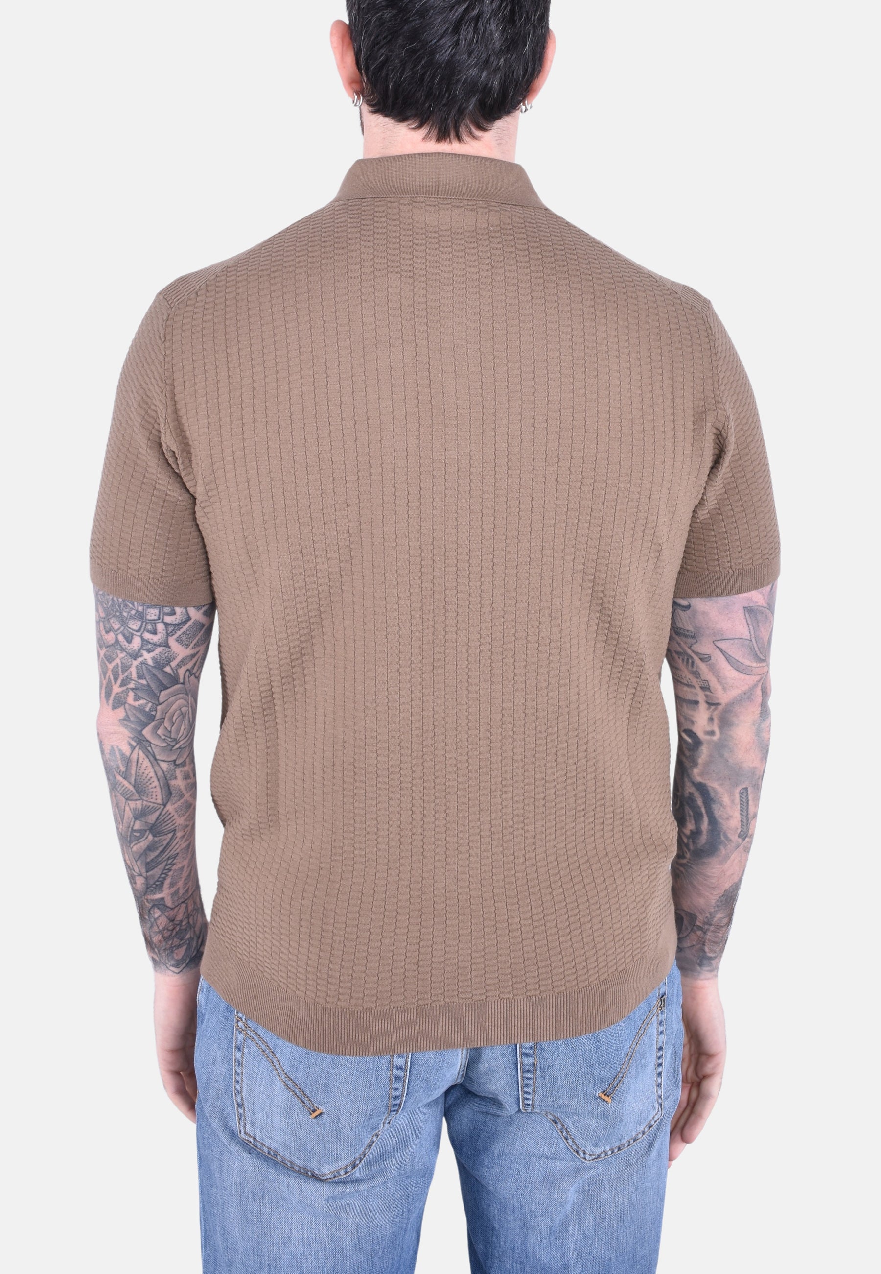 Questa polo a maniche corte in cotone e lino si distingue per la sua lavorazione in punto Arabesco, che dona al tessuto una texture raffinata e dinamica, esaltandone la morbidezza e la leggerezza.