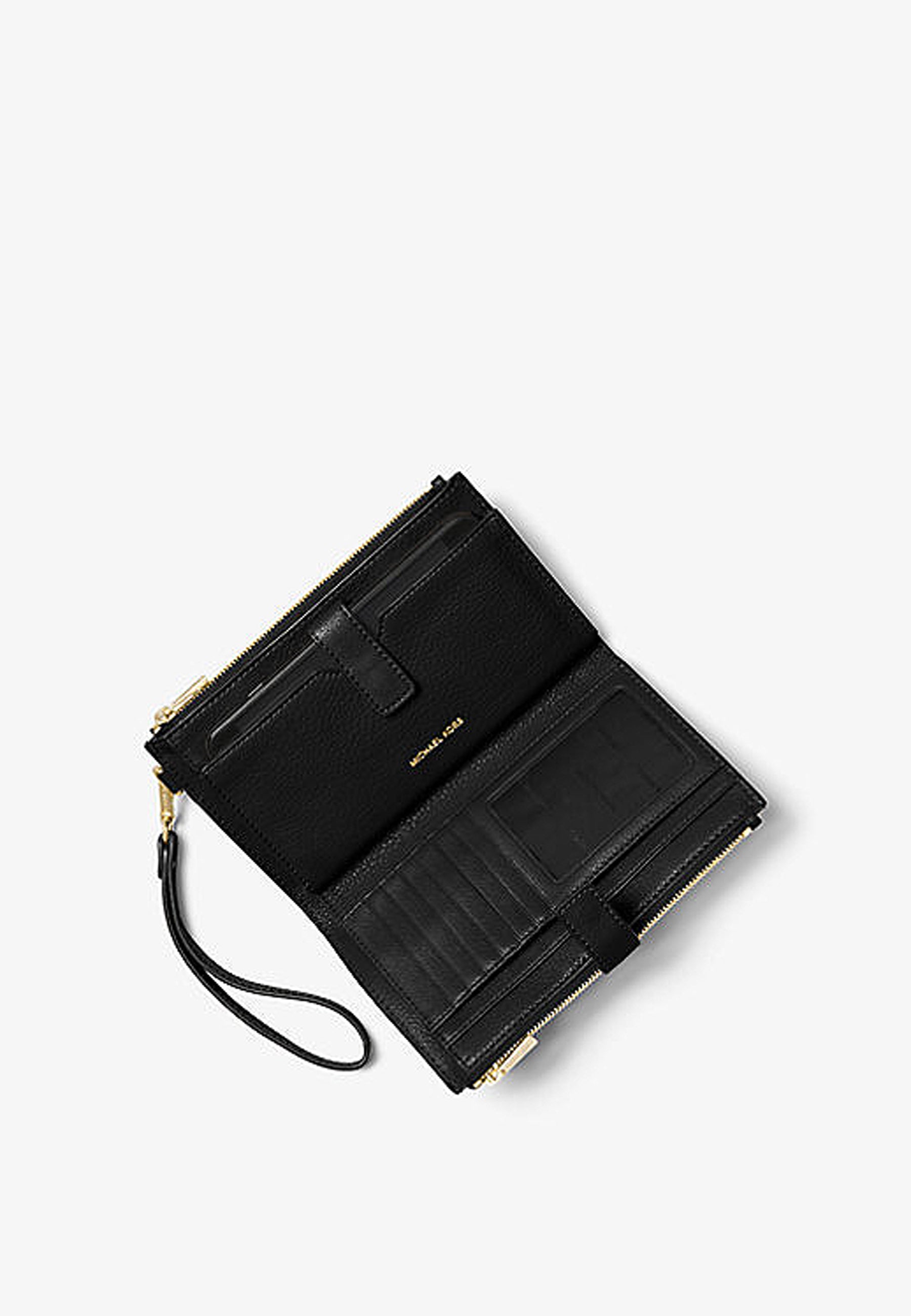 Questa elegante pochette da polso in pregiata pelle martellata è un accessorio intramontabile, grazie alle due sezioni laterali con zip che si aprono per svelare uno scomparto centrale dotato di tasche per riporre comodamente le carte di credito o il cellulare. Grazie al pratico cinturino, puoi indossarla da sola o portarla con te in una borsa tote.