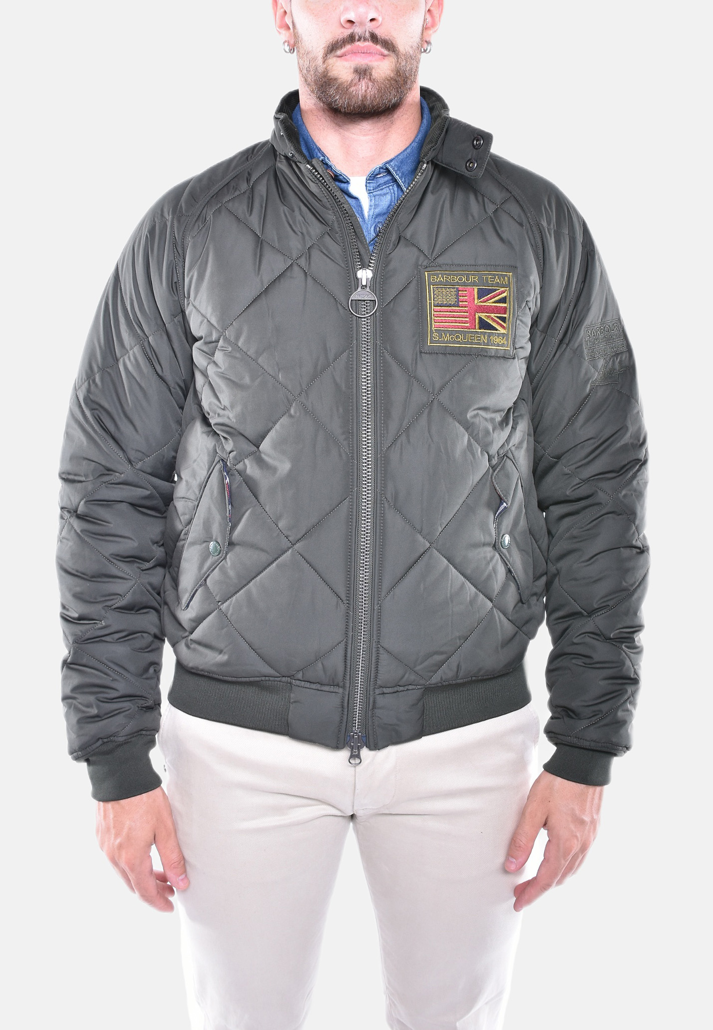La giacca trapuntata Merchant di Barbour International, rivisitazione del classico bomber, presenta una trapuntatura a quadri da 10 cm e un collo a listino con cinturino e bottoni a pressione, che la rendono perfetta da abbinare a un look elegante. La chiusura a zip bidirezionale sul davanti e le due tasche a filetto sulla parte inferiore le conferiscono un'estrema praticità. La giacca presenta un orlo e polsini a coste, per una silhouette d’ispirazione biker. Questa giacca è impreziosita da una patch con logo Barbour International Steve McQueen ricamata a sinistra sul petto.