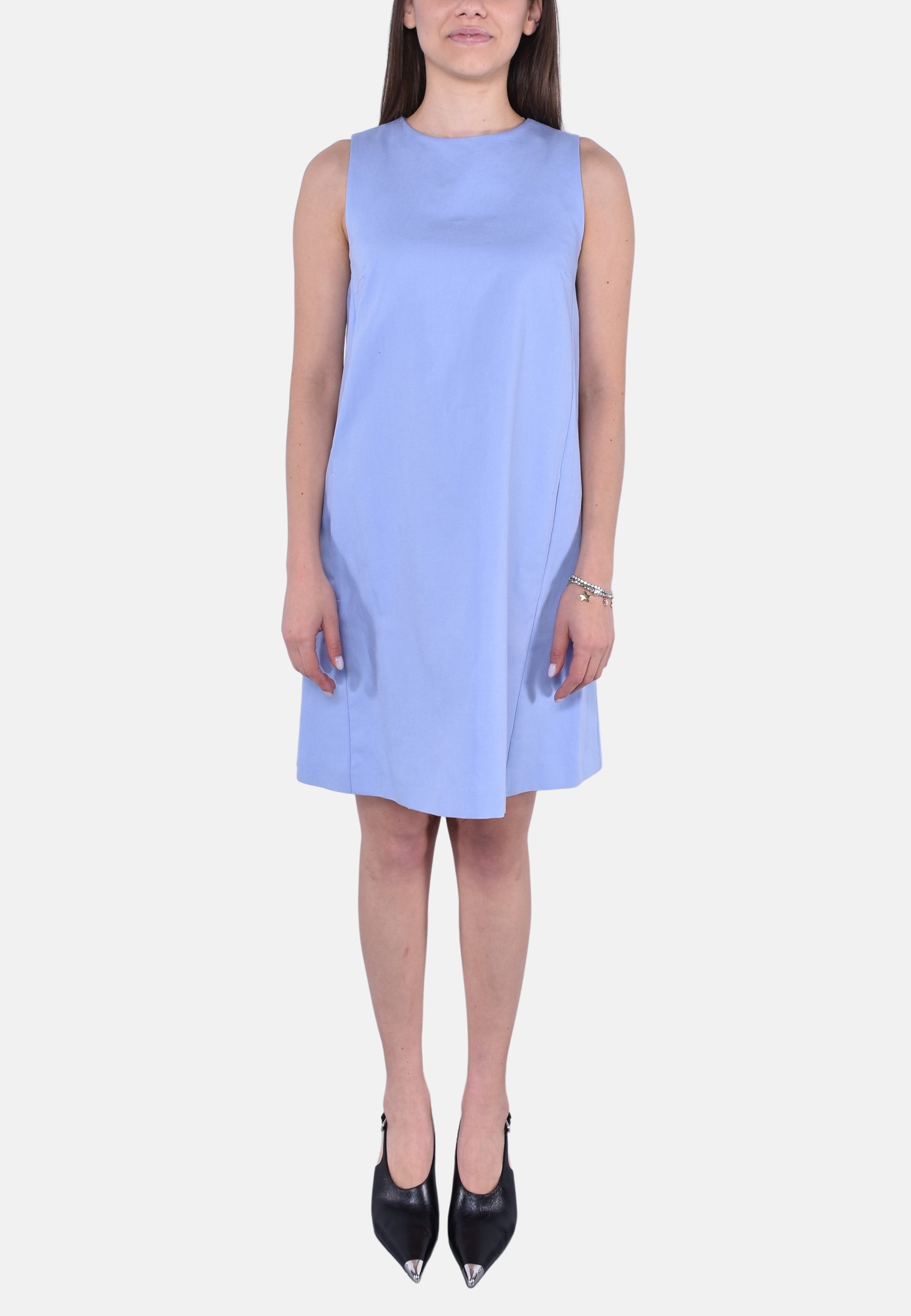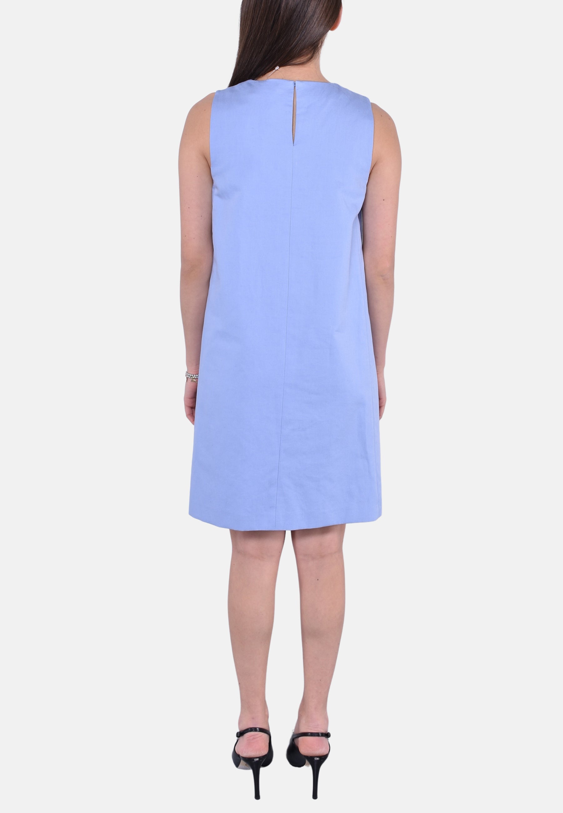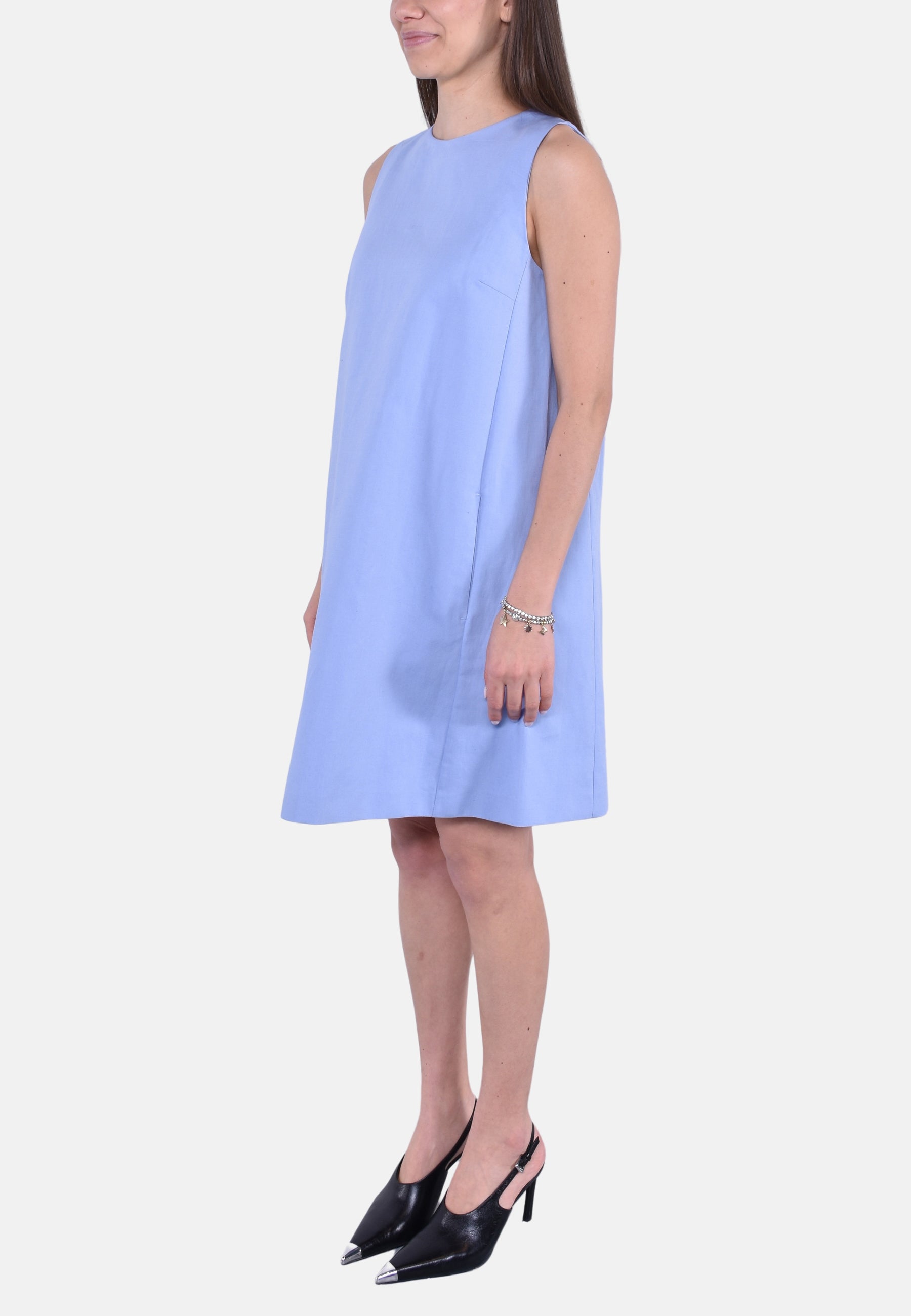 Abito smanicato corto in tela di cotone e lino, caratterizzato da una silhouette a trapezio svasata al fondo. Modello foderato con scollo a giro e tasche inserite nei fianchi. Chiusura a goccia con piccolo bottone sul retro del collo.