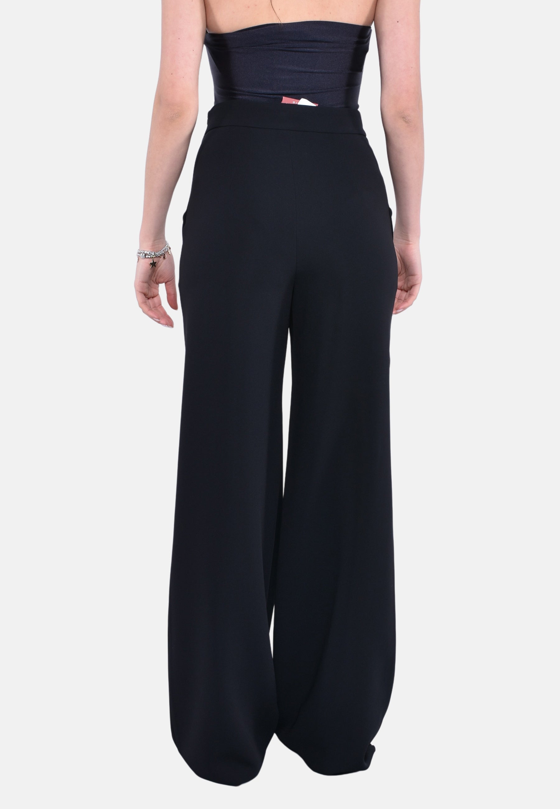 Pantalone in cady, caratterizzato da una silhouette con gamba leggermente ampia e bottoni stile marinière in vita e sui fianchi, ricoperti in tono. Rifinito con piccole pinces in vita sul retro e tasche alla francese. Chiusura con lampo sul fianco sinistro indossato.