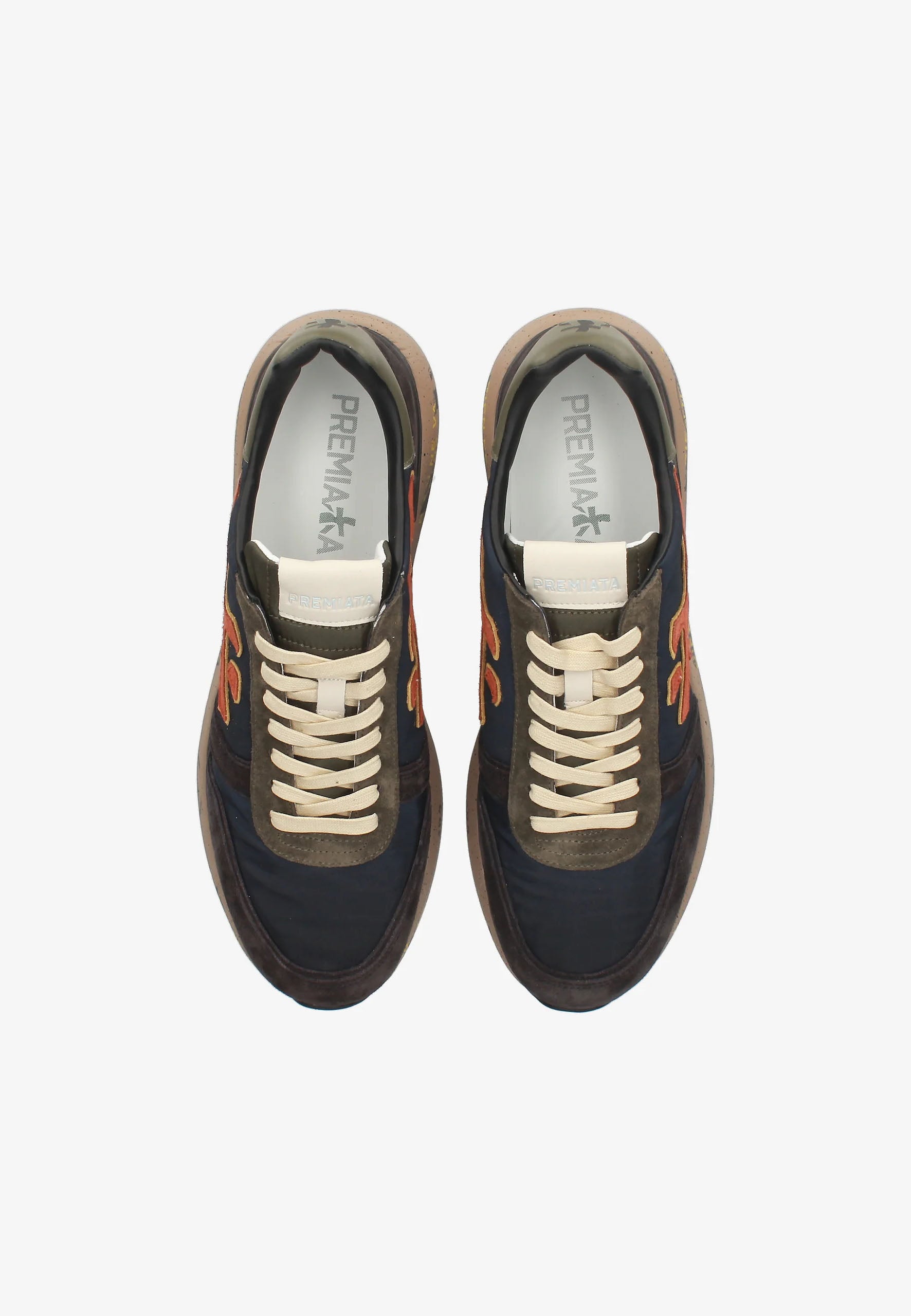 Sneakers Mick in mix di materiali e pellami di qualità. La scarpa è realizzata nella tonalità del blu per uno stile casual. L'iconica silhouette è arrichita dal logo Premiata.