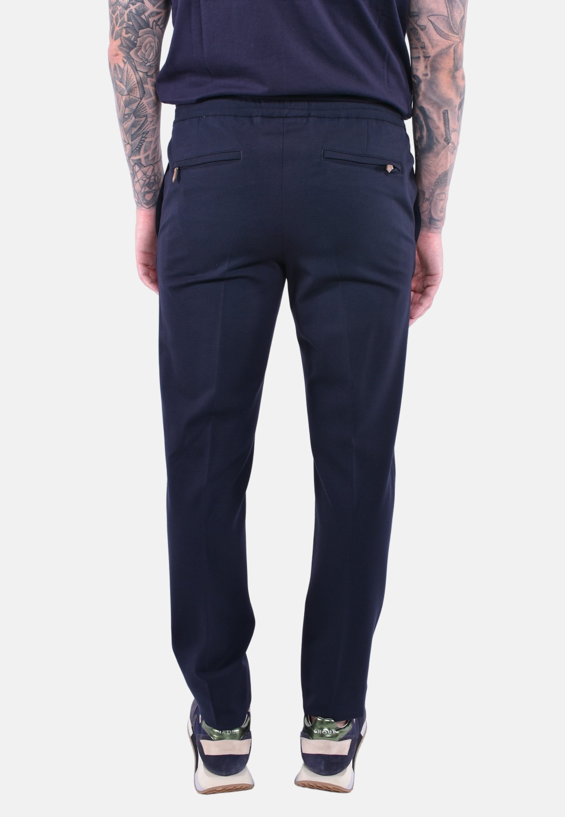 Pantalone jogger in tessuto stretch con vestibilità morbida. Coulisse color grigio in contrasto, chiusura con bottone e pences.
