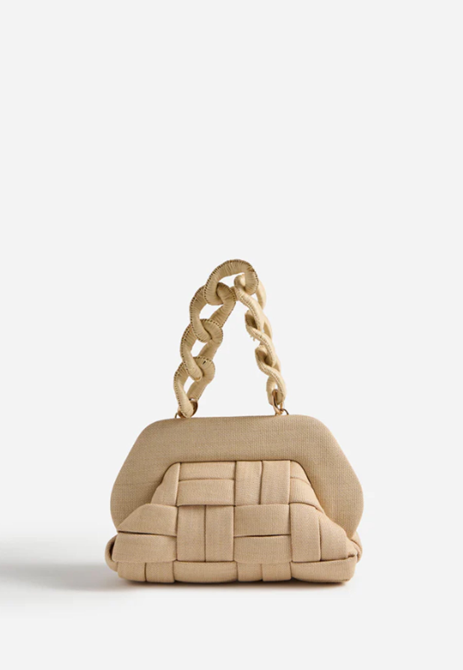 Borsa di colore beige con chiusura magnetica, tracolla regolabile e rimovibile, manico superiore.