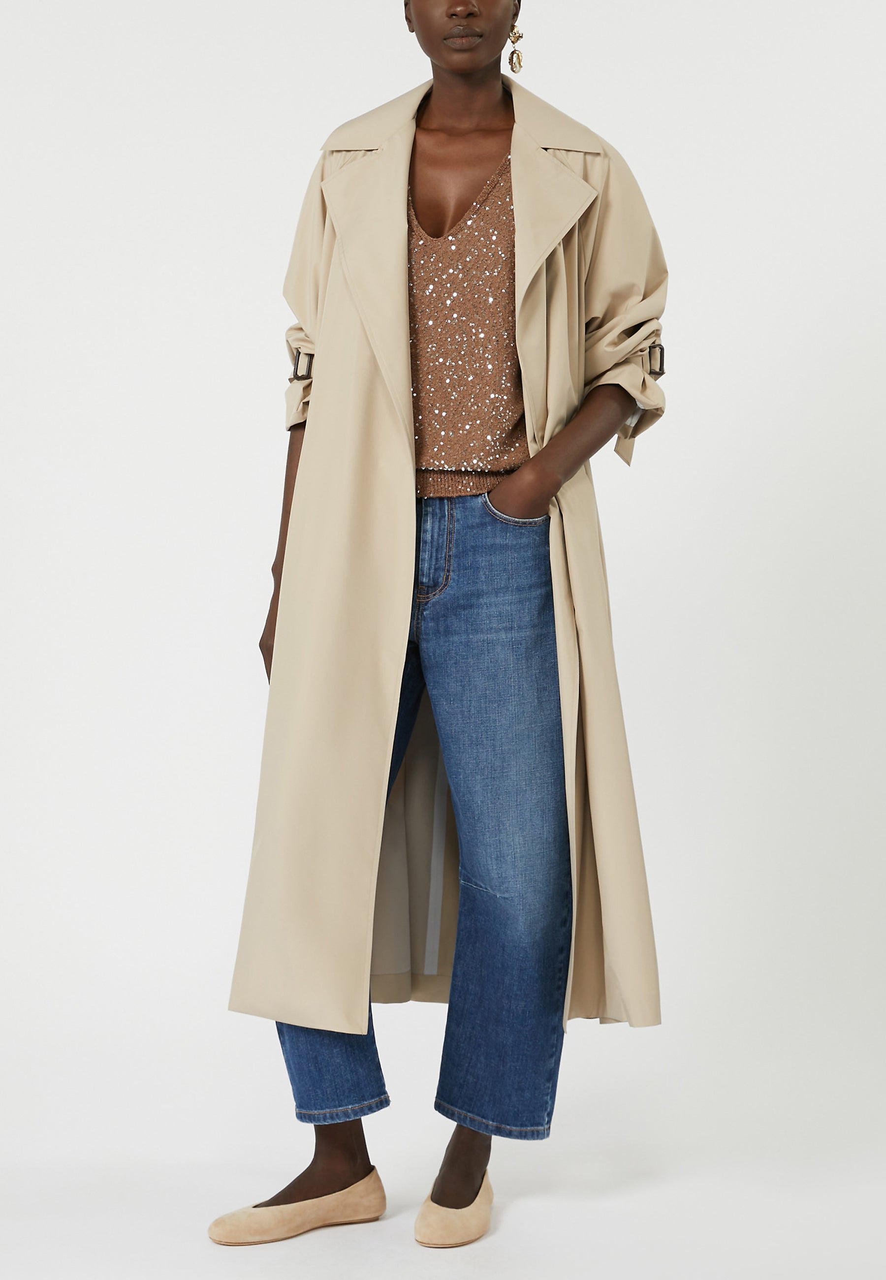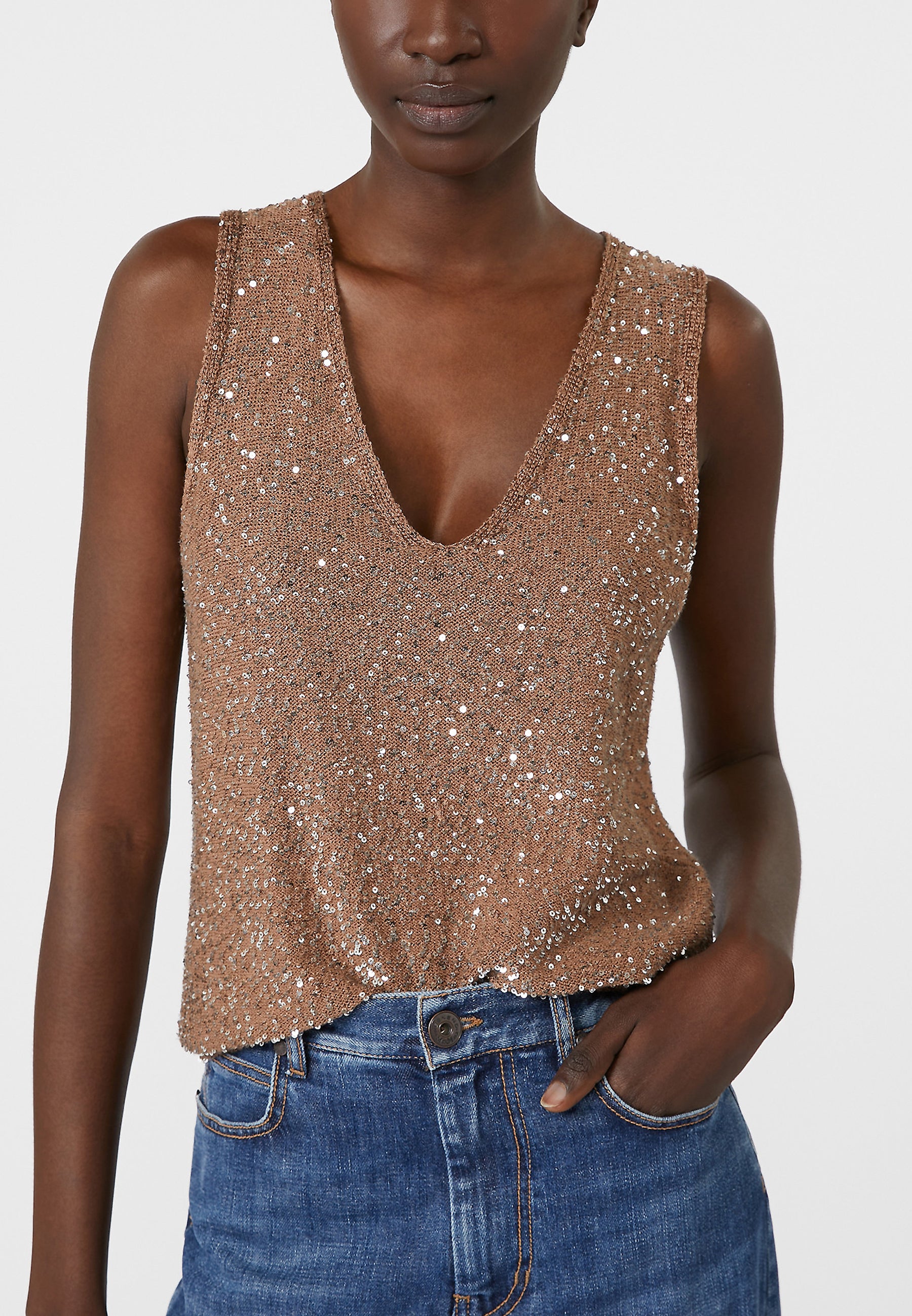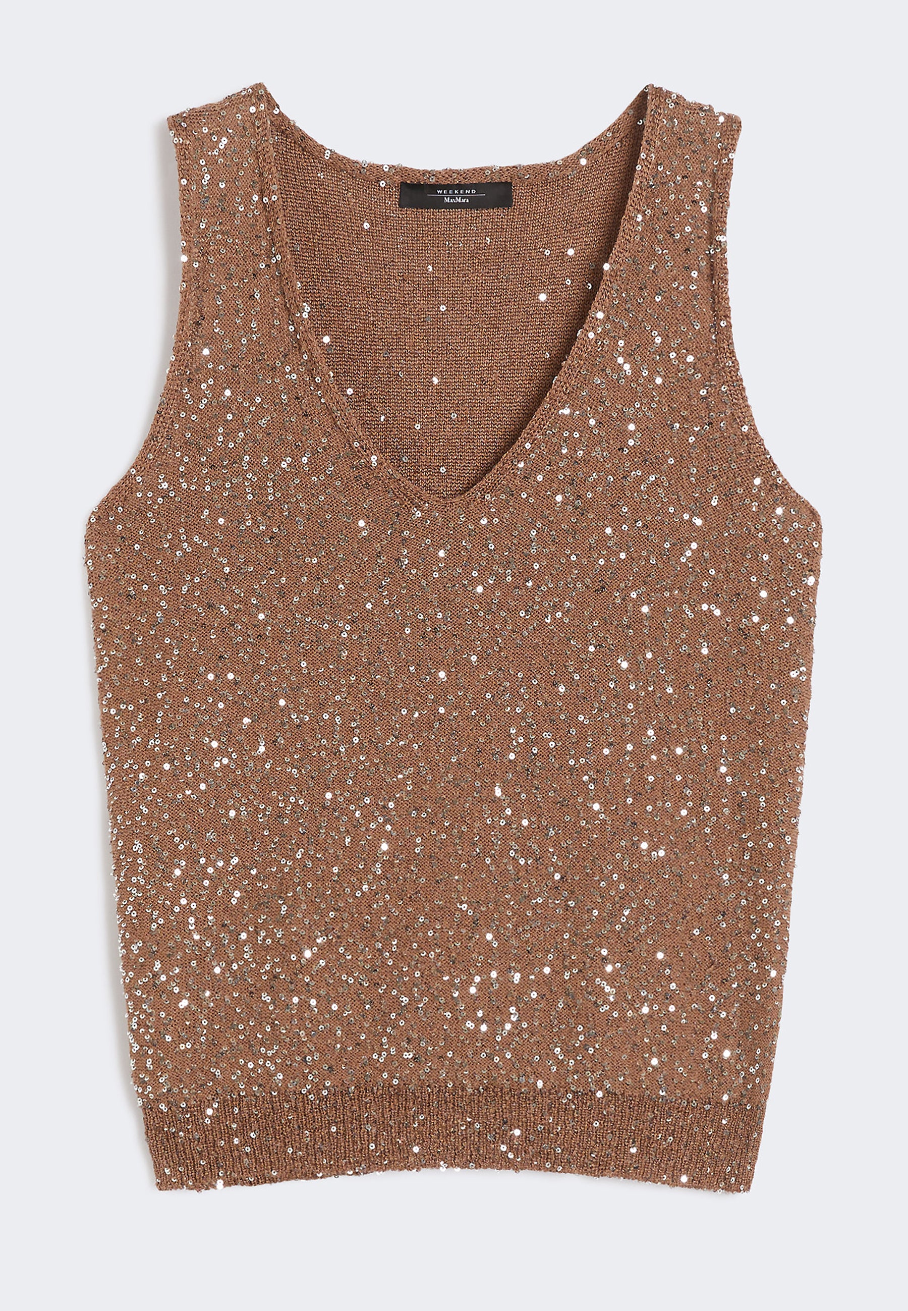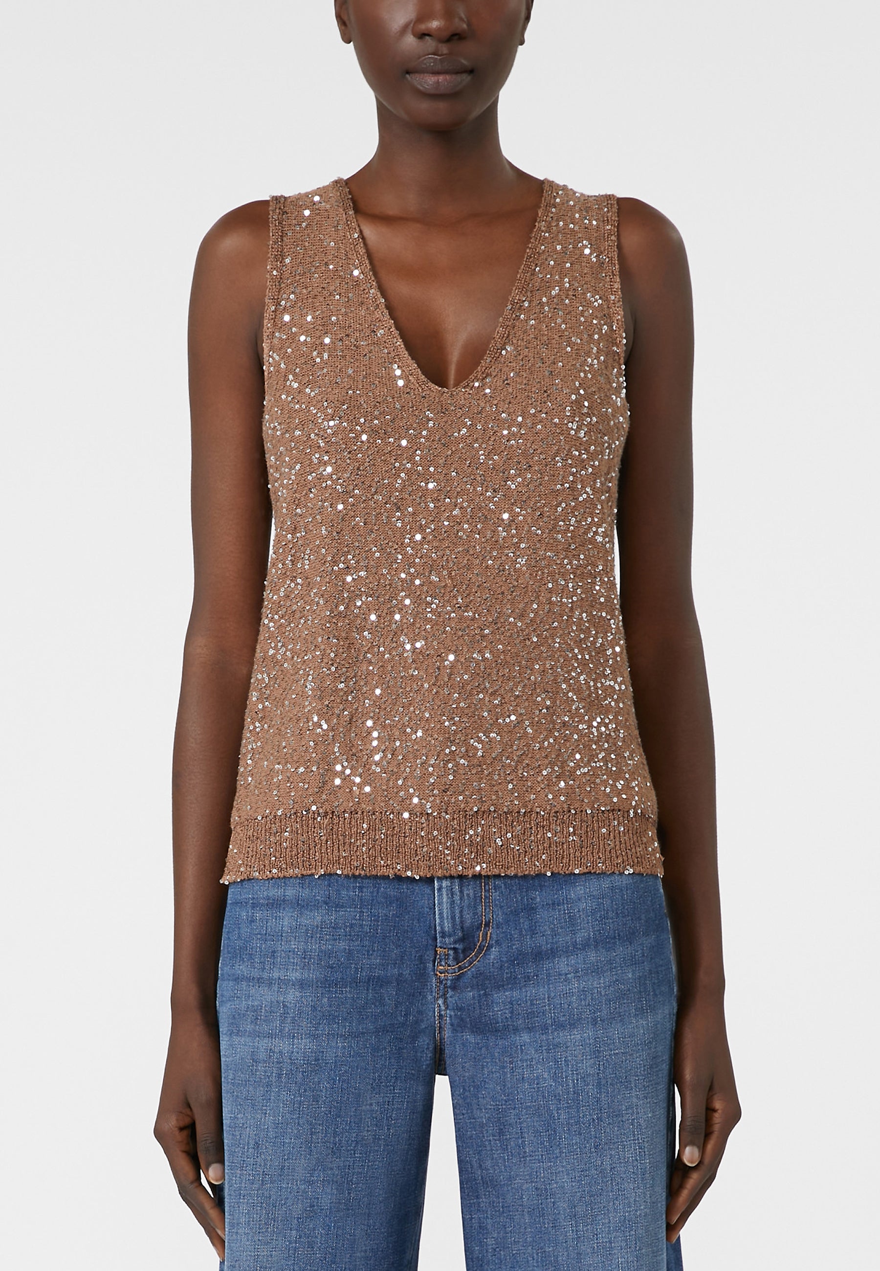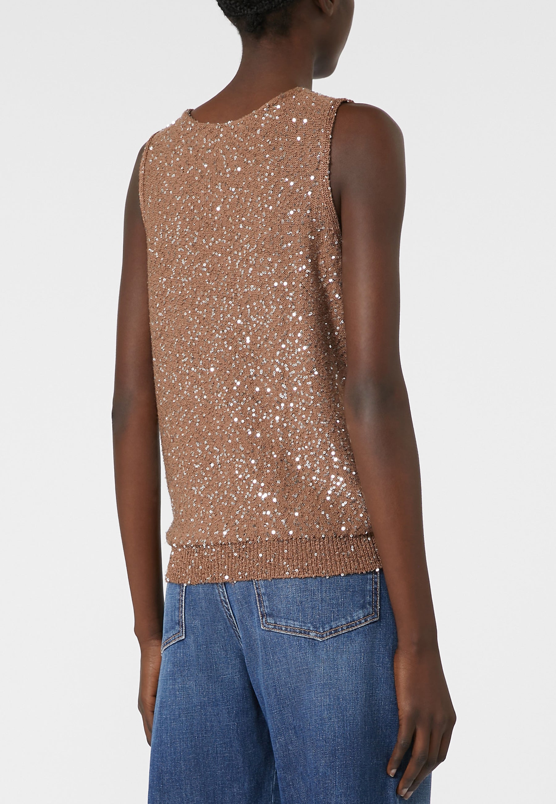 Top smanicato impreziosito da un ricamo di paillette all over.