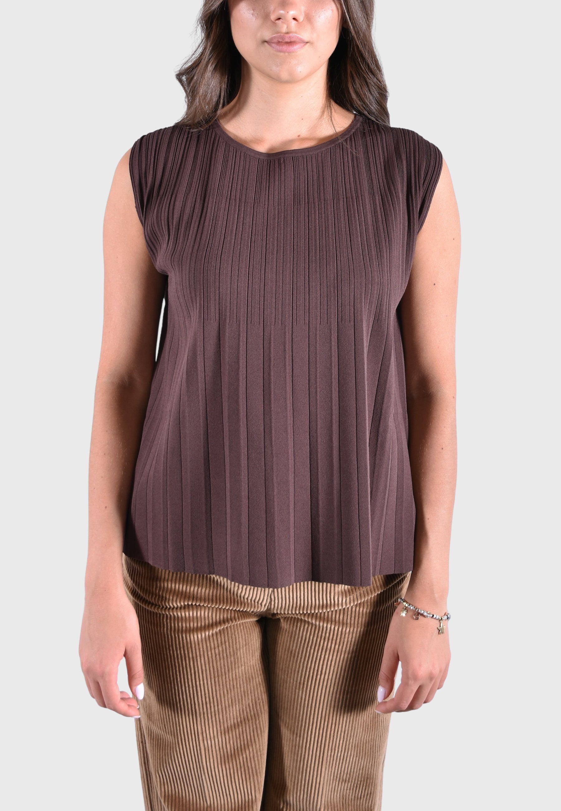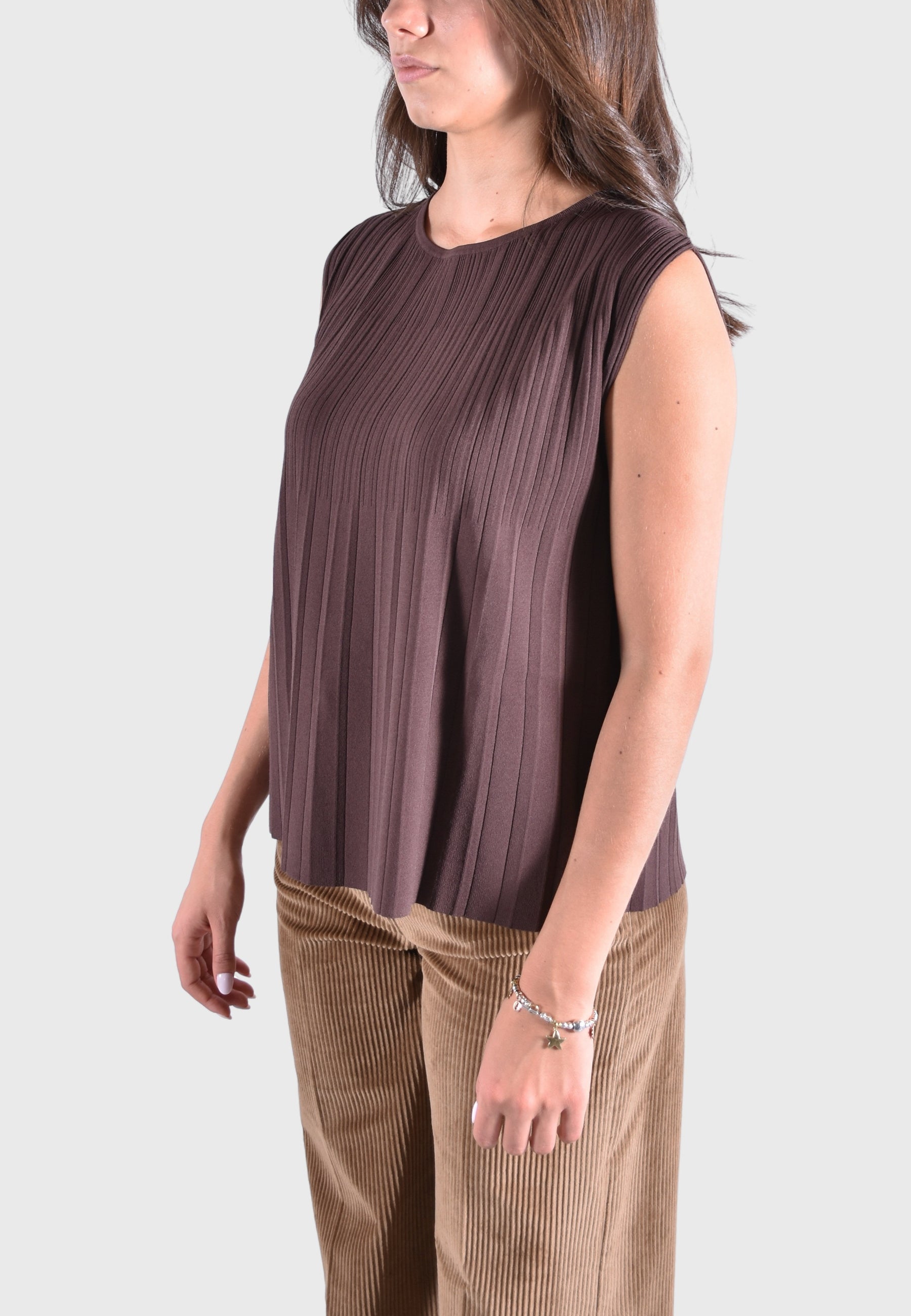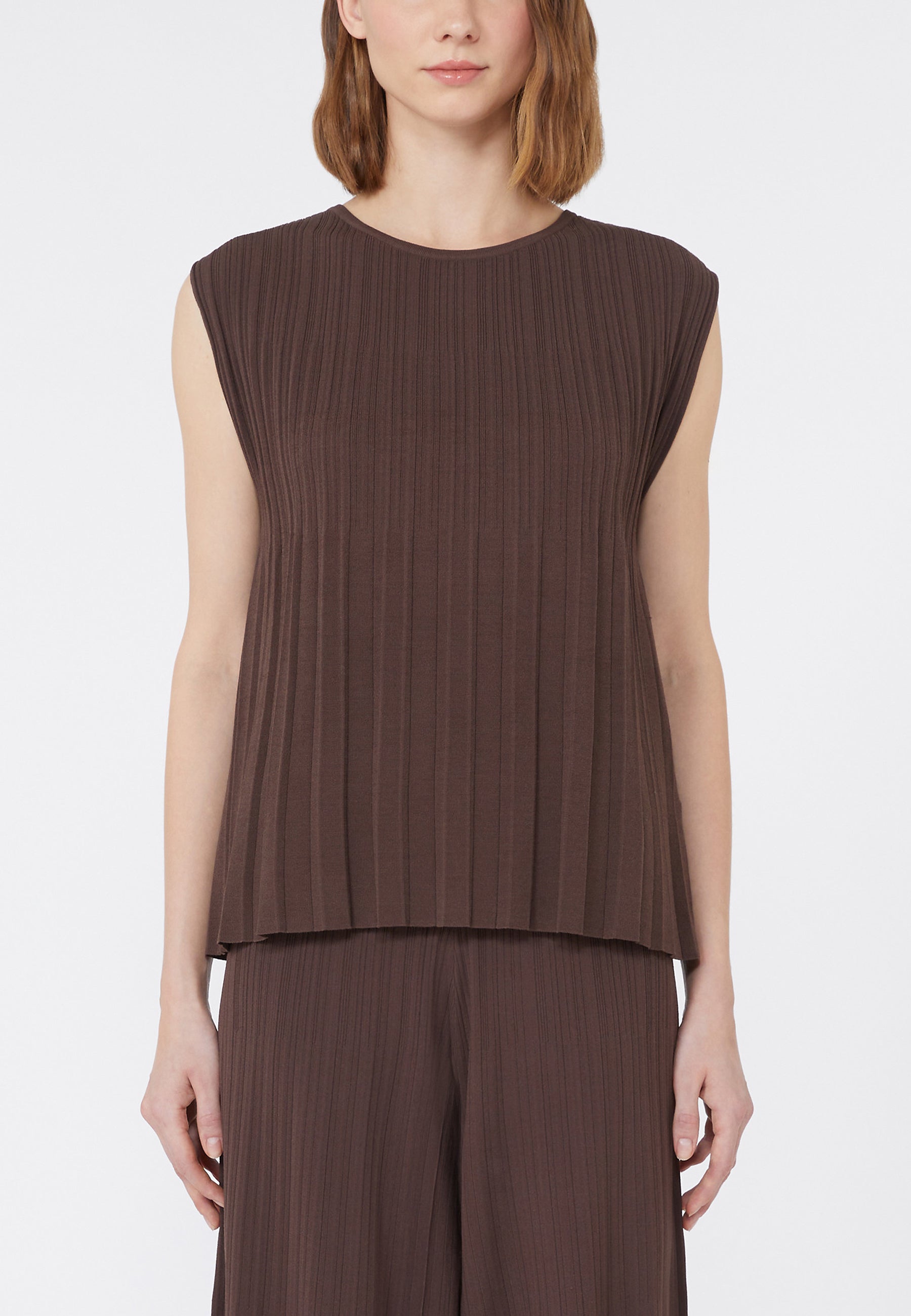 T-shirt a pieghe plissé, lavorata con effetto dégradé che evidenzia la silhouette.