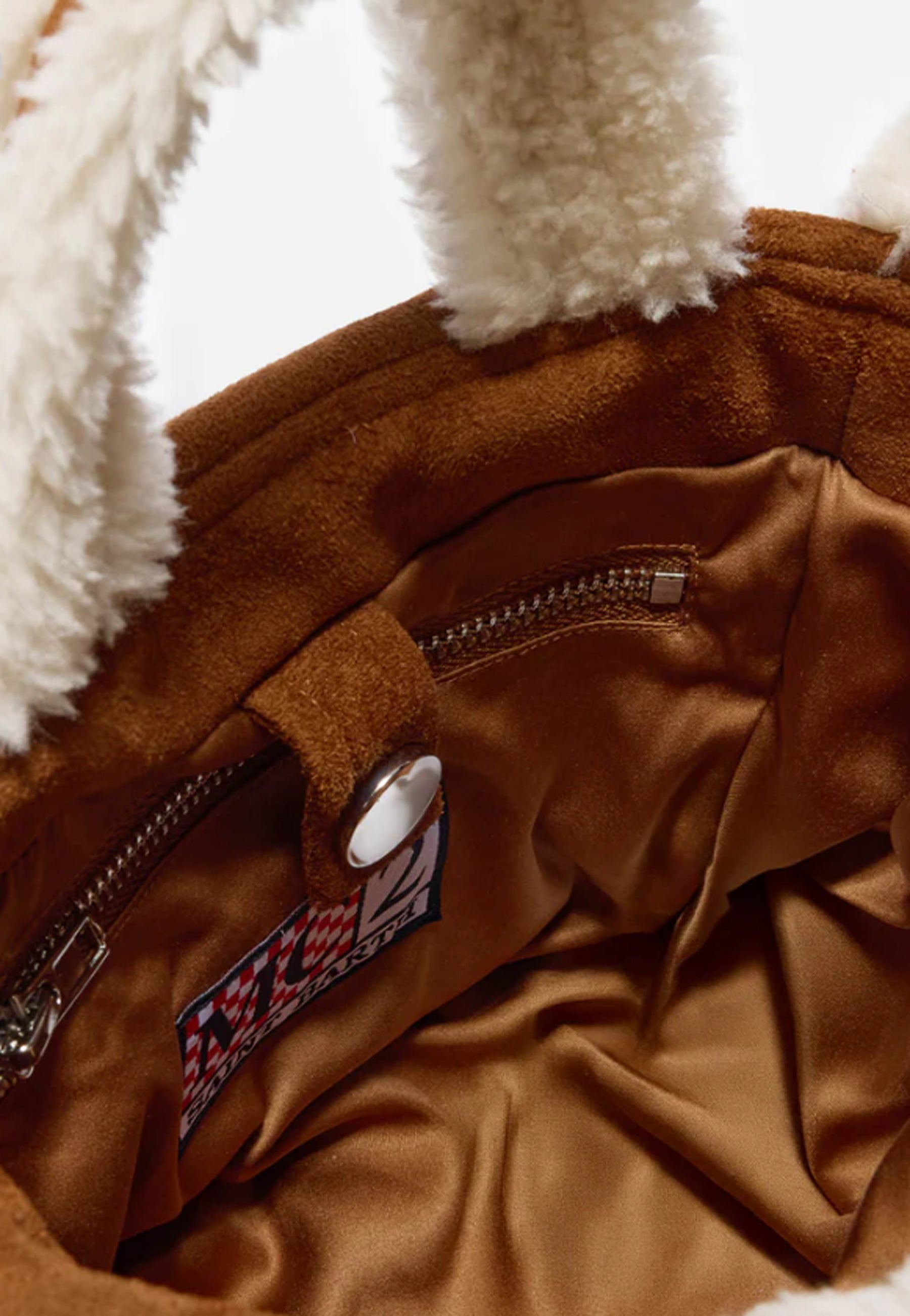 La Vanity Mini Shearling cammello unisce calore e stile per un look sofisticato e contemporaneo.