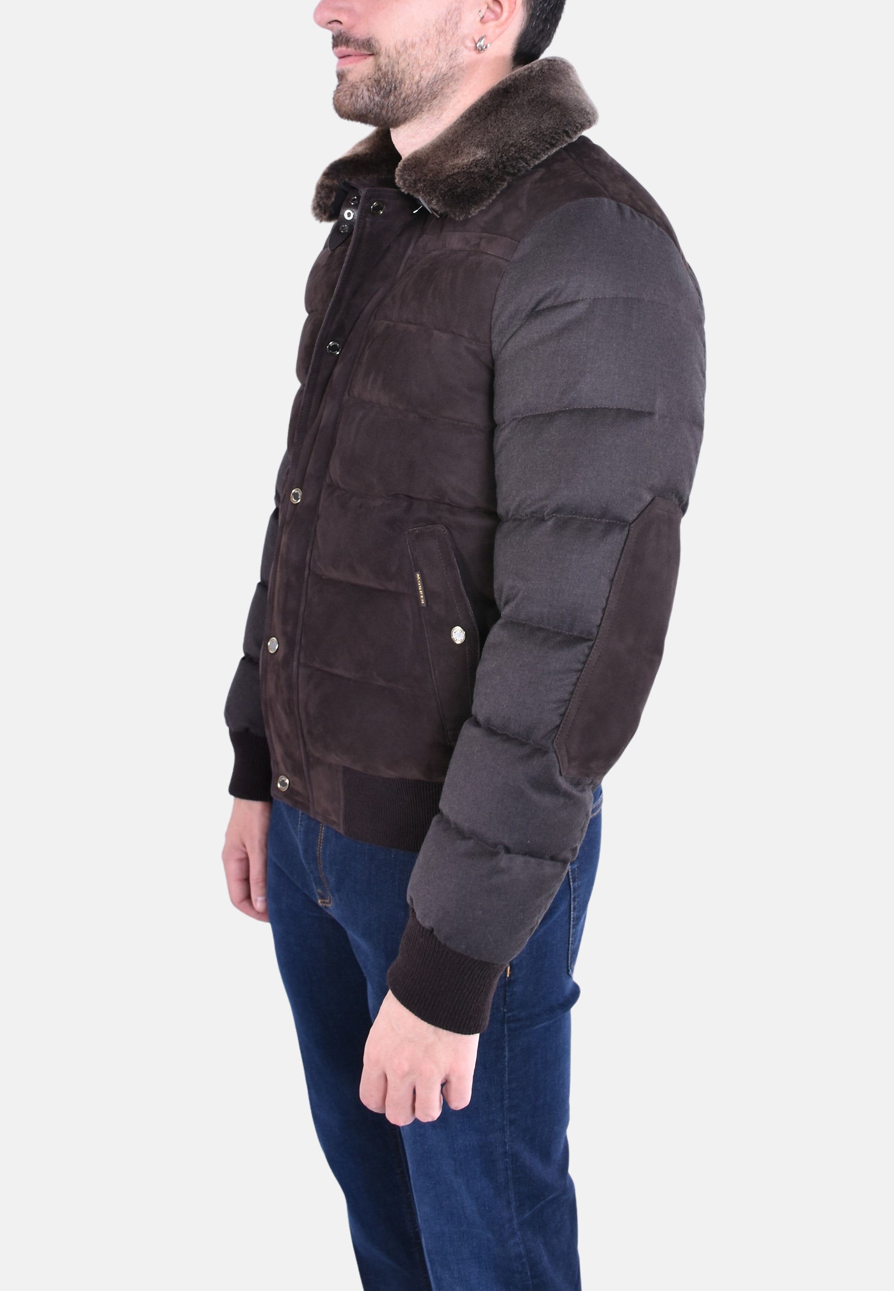 Bomber ibrido trapuntato a boudin imbottito in piuma d'oca, realizzato in misto pelle scamosciata e lana. Doppia chiusura frontale con bottoni a pressione a vista e laccetto in pelle con fibbia sul collo. Fondo e polsi in maglia. Tasche con chiusura da bottoni a pressione a vista. Tasche interne porta documenti con rifiniture con fettucce logate.
