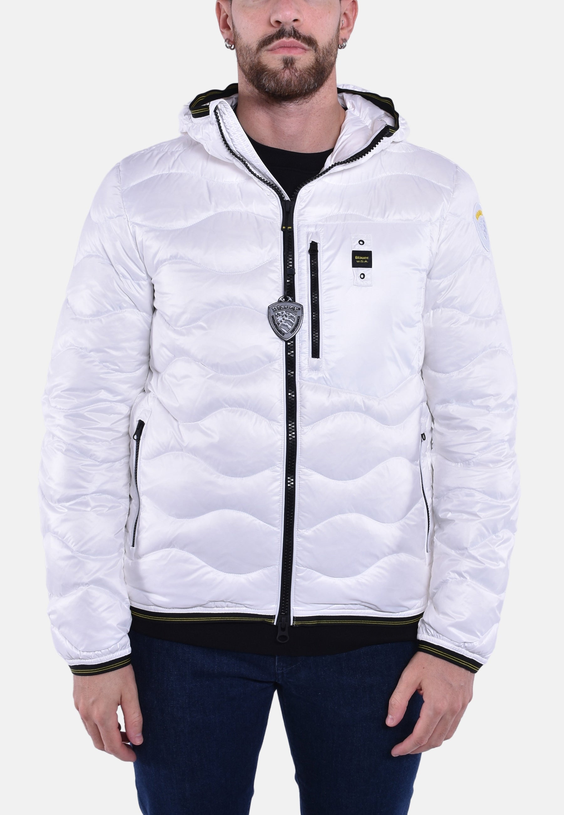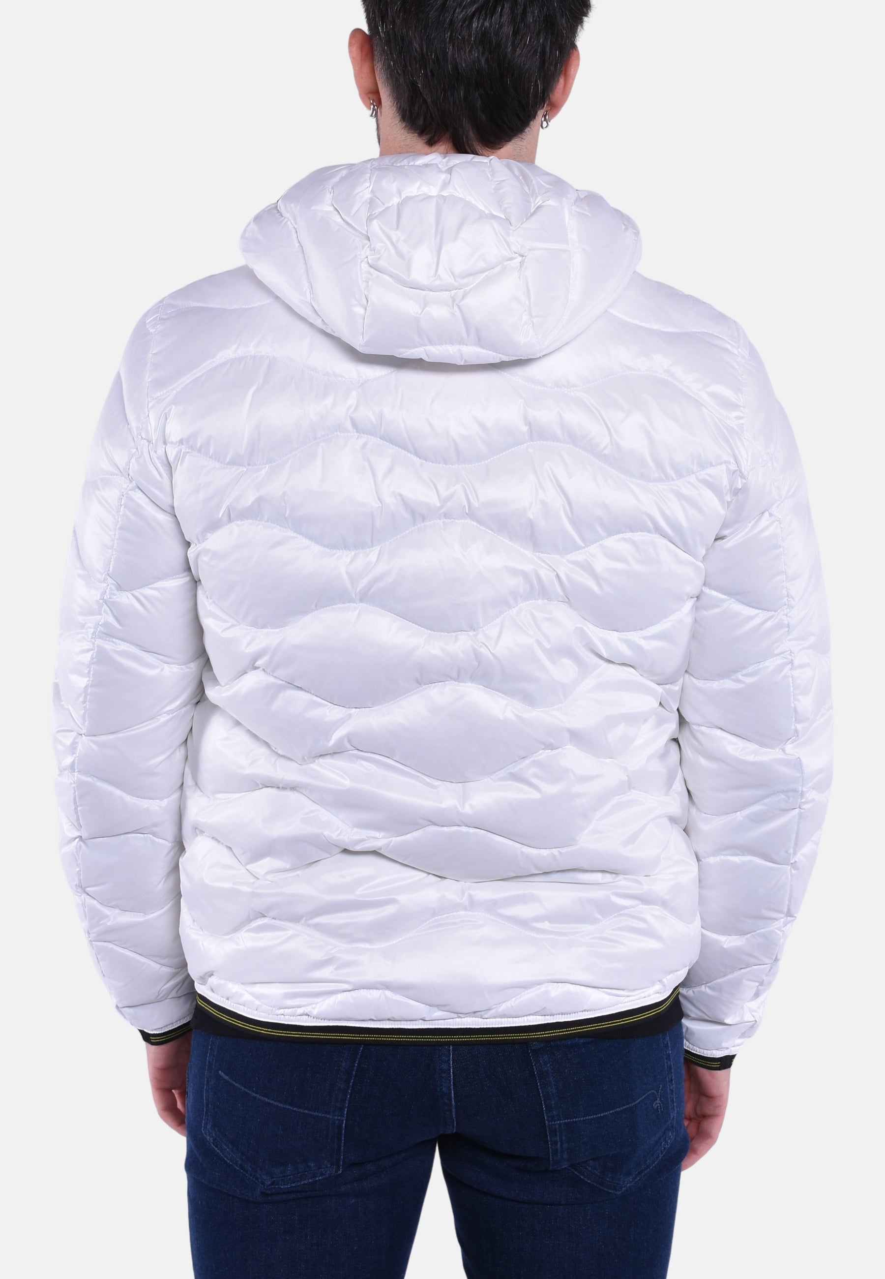Piumino caldo ma leggero, in nylon lucido micro-rip con cappuccio, trapuntato a onde orizzontali.
