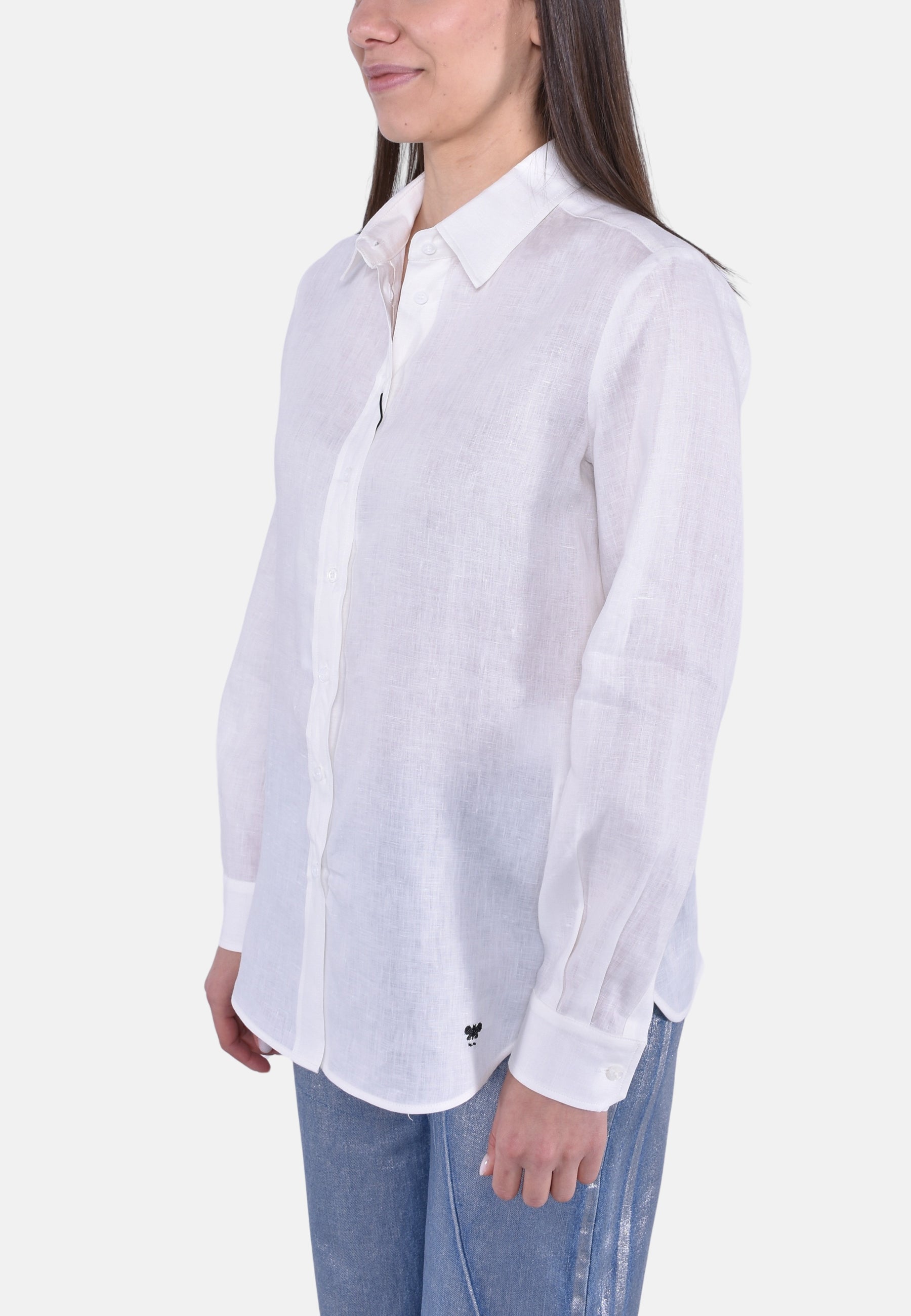 Camicia in puro lino, caratterizzata da una silhouette classica con fondo stondato. Colletto a punta, maniche lunghe con polsini, taglio sprone sul retro e piega centrale sulla schiena. Personalizzata con logo ricamato a fondo capo, lato sinistro indossato. Chiusura con bottoni a vista in tono.